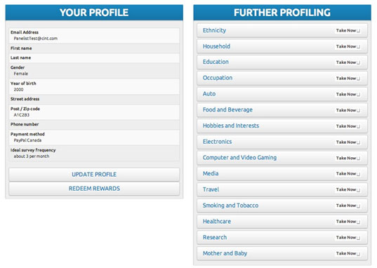 Here you may update both your personal information (password, address, etc.) and you may update your profiling for future surveys: